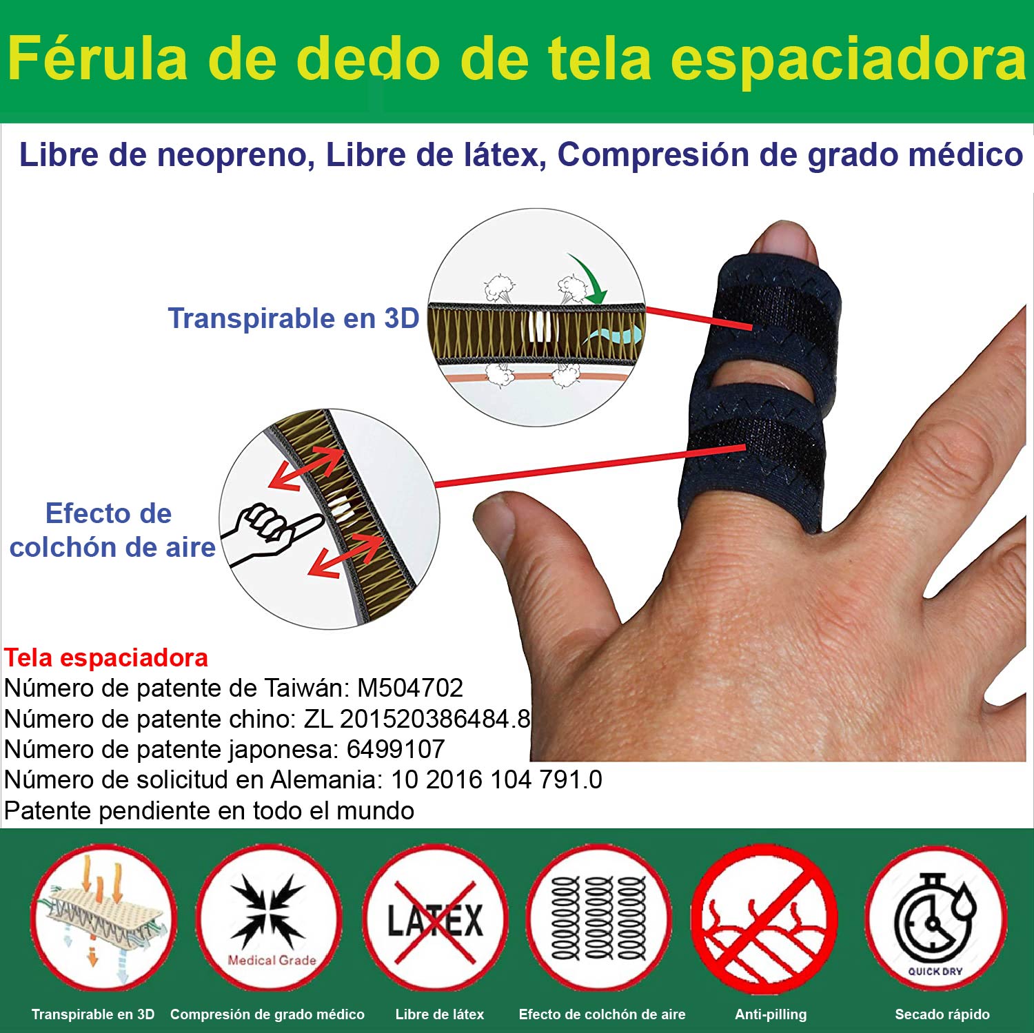 Todos nuestros productos están fabricados con tela espaciadora. La tela espaciadora debería ser uno de los mejores materiales para aparatos deportivos y médicos del mundo. Sólo la Tela Espaciadora tiene un efecto de colchón de aire. La mayoría de las Telas Espaciadoras en el mercado no tienen suficiente compresión. Utilizamos nuestra técnica patentada para fabricar una tela espaciadora capaz de brindar compresión de grado médico.