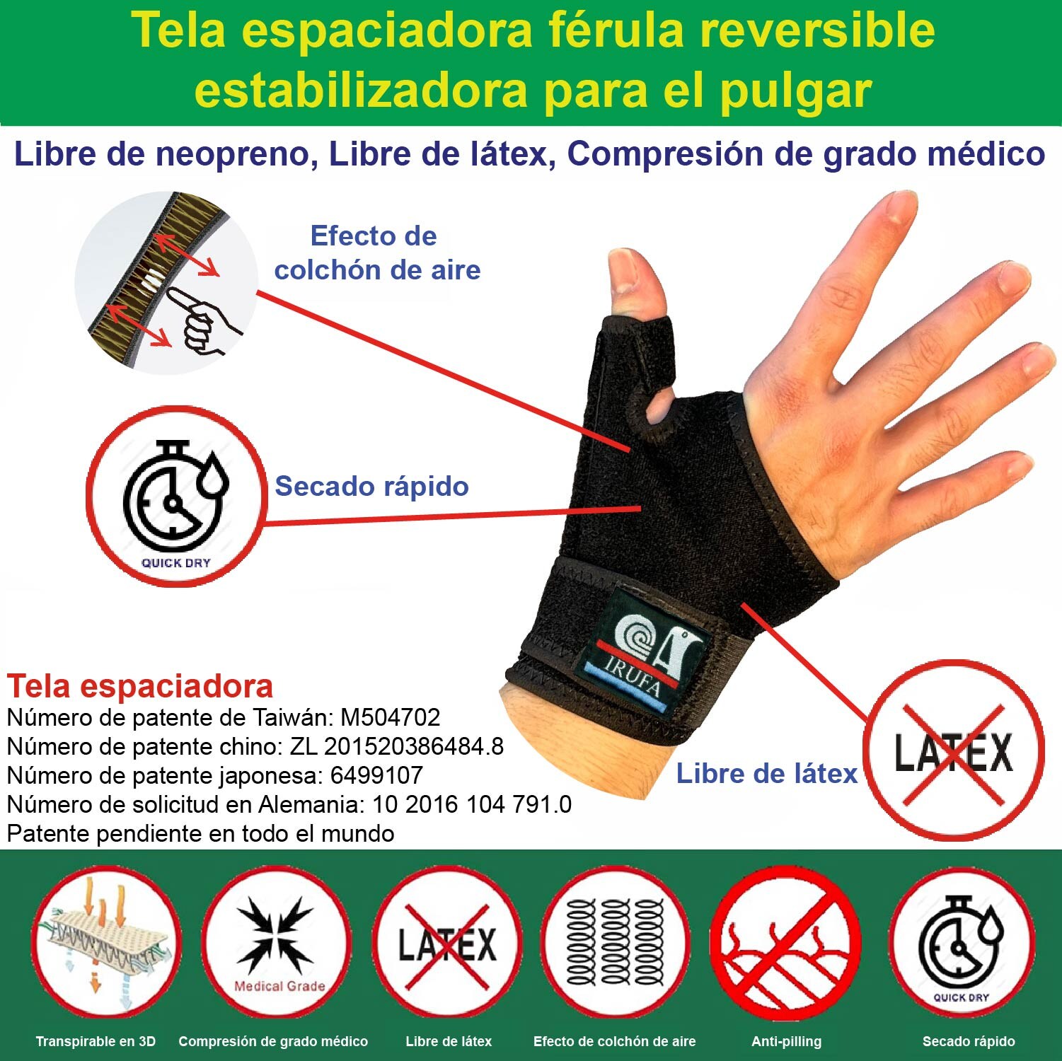 Todos nuestros productos están fabricados con tela espaciadora. La tela espaciadora debería ser uno de los mejores materiales para aparatos deportivos y médicos del mundo. Sólo la Tela Espaciadora tiene un efecto de colchón de aire. La mayoría de las Telas Espaciadoras en el mercado no tienen suficiente compresión. Utilizamos nuestra técnica patentada para fabricar una tela espaciadora capaz de brindar compresión de grado médico.